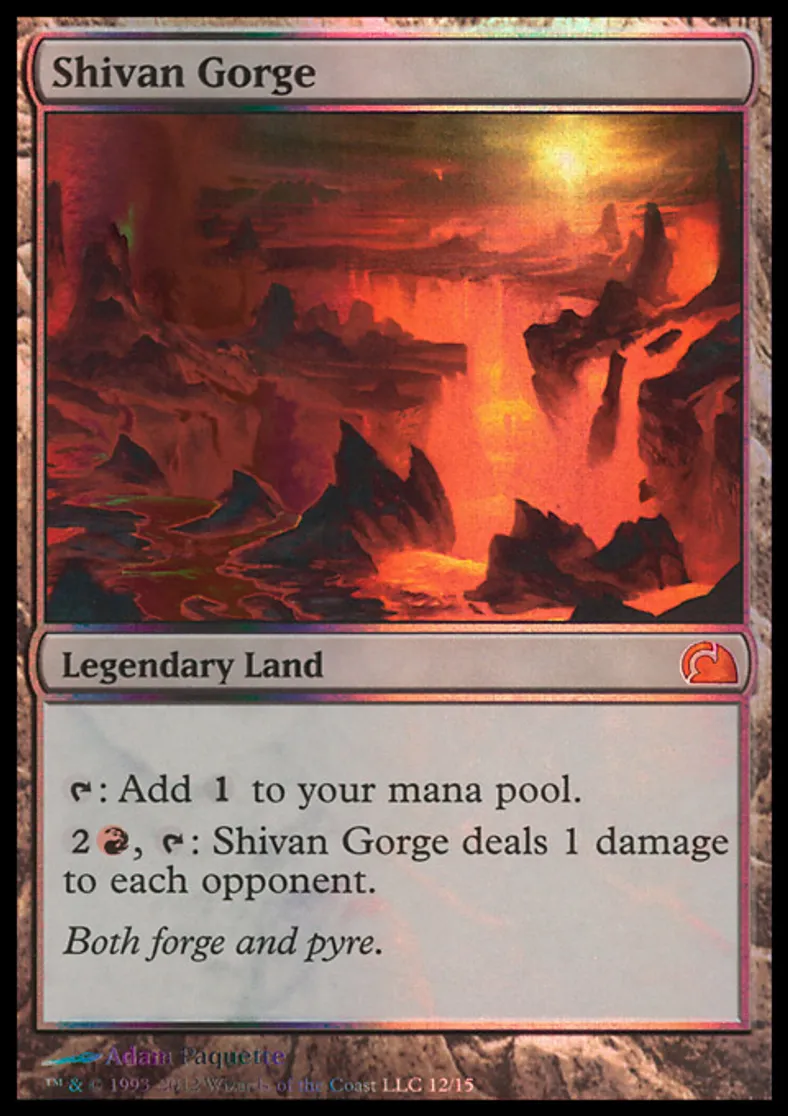 | Oracle Text | {{t}}: Add {{1}} to your mana pool. {{2}}{{r}}, {{t}}: Shivan Gorge deals 1 damage to each opponent. | ||