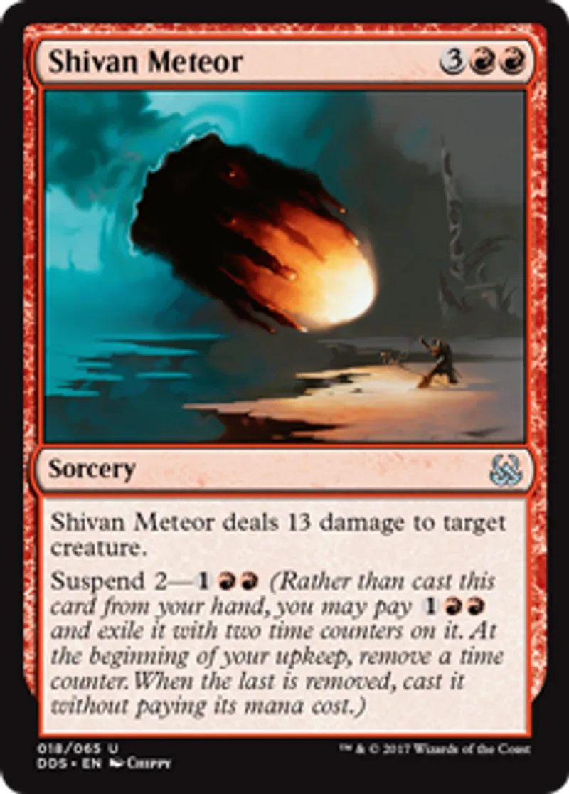 | Oracle Text | Shivan Meteor deals 13 damage to target creature. Suspend 2—{{1}}{{r}}{{r}} (Rather than cast this card from your hand, you may pay {{1}}{{r}}{{r}} and exile it with two time counters on it. At the beginning of your upkeep, remove a time counter. When the last is removed, cast it without paying its mana cost.) | ||
