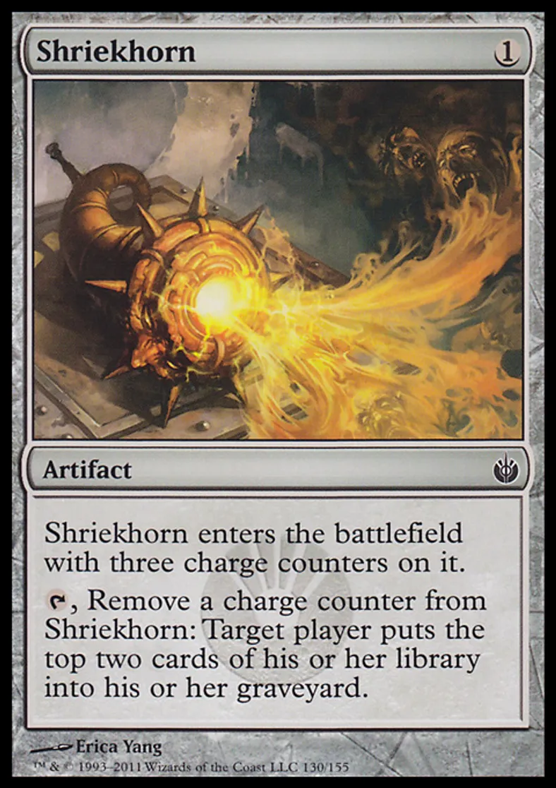 | Oracle Text | Shriekhorn enters the battlefield with three charge counters on it. {{t}}, Remove a charge counter from Shriekhorn: Target player puts the top two cards of his or her library into his or her graveyard. | ||