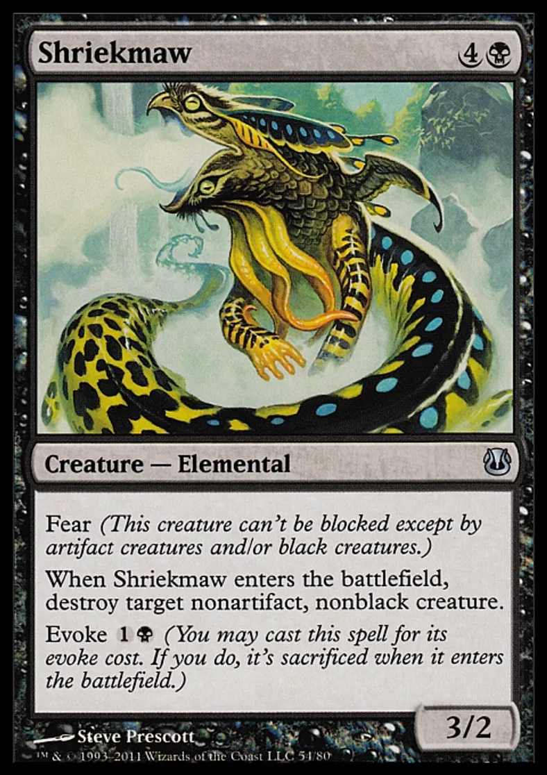 | Oracle Text | Fear (This creature can't be blocked except by artifact creatures and/or black creatures.) When Shriekmaw enters the battlefield, destroy target nonartifact, nonblack creature. Evoke {{1}}{{b}} (You may cast this spell for its evoke cost. If you do, it's sacrificed when it enters the battlefield.) | ||