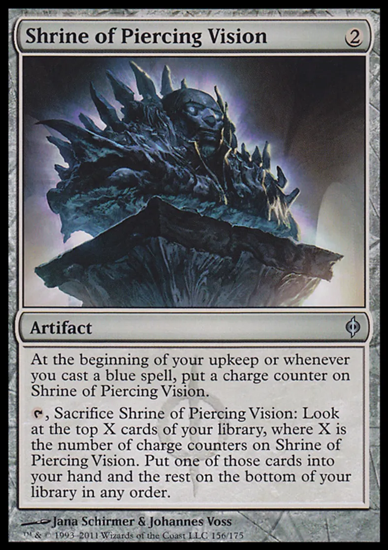 | Oracle Text | At the beginning of your upkeep or whenever you cast a blue spell, put a charge counter on Shrine of Piercing Vision. {{t}}, Sacrifice Shrine of Piercing Vision: Look at the top X cards of your library, where X is the number of charge counters on Shrine of Piercing Vision. Put one of those cards into your hand and the rest on the bottom of your library in any order. | ||