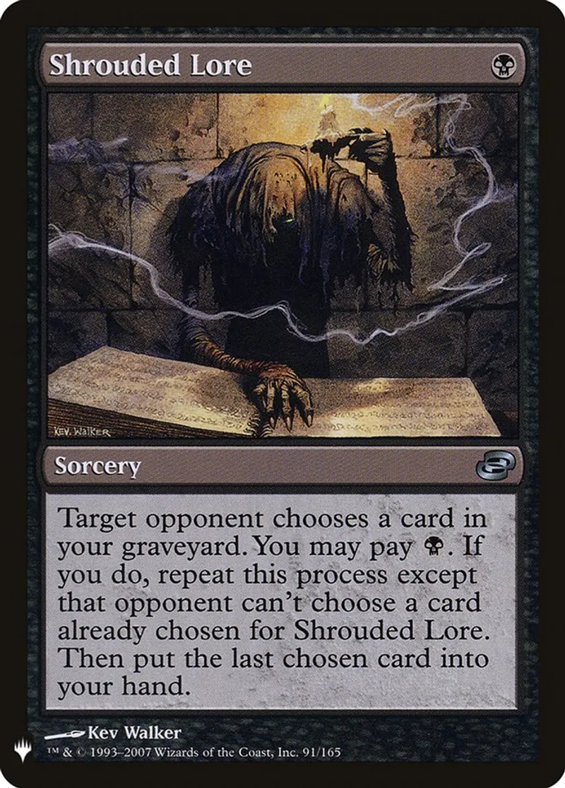 | Oracle Text | Target opponent chooses a card in your graveyard. You may pay {B}. If you do, repeat this process except that opponent can't choose a card already chosen for Shrouded Lore. Then put the last chosen card into your hand. | ||
