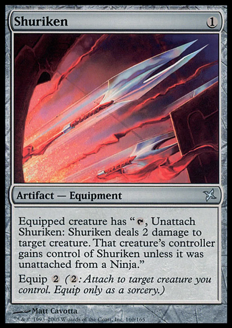 | Oracle Text | Equipped creature has "{{t}}, Unattach Shuriken: Shuriken deals 2 damage to target creature. That creature's controller gains control of Shuriken unless it was unattached from a Ninja." Equip {{2}} ({{2}}: Attach to target creature you control. Equip only as a sorcery.) | ||