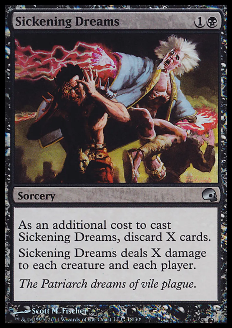 | Oracle Text | As an additional cost to cast Sickening Dreams, discard X cards. Sickening Dreams deals X damage to each creature and each player. | ||