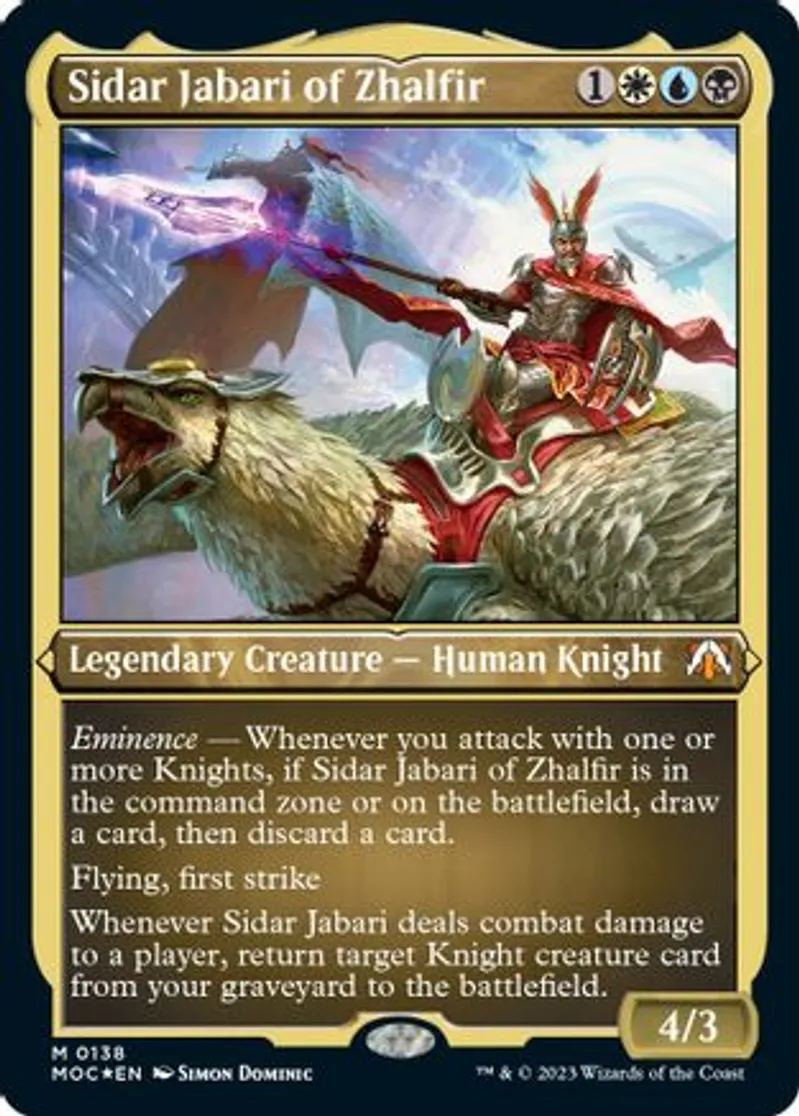 | Oracle Text | Eminence — Whenever you attack with one or more Knights, if Sidar Jabari of Zhalfir is in the command zone or on the battlefield, draw a card, then discard a card.