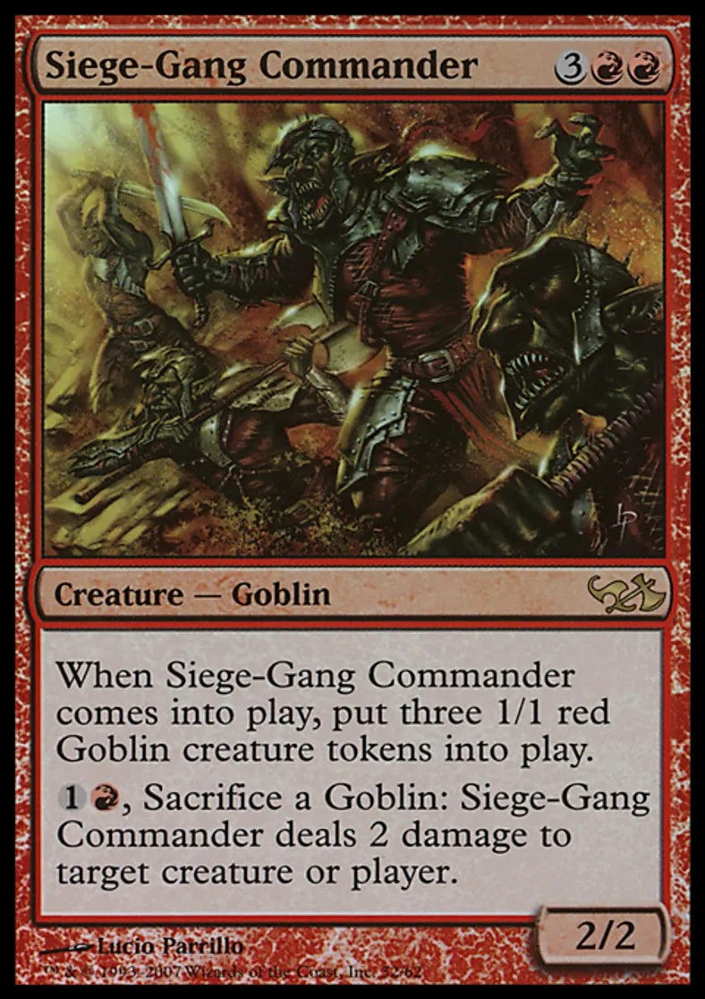 | Oracle Text | When Siege-Gang Commander enters the battlefield, put three 1/1 red Goblin creature tokens onto the battlefield. {{1}}{{r}}, Sacrifice a Goblin: Siege-Gang Commander deals 2 damage to target creature or player. | ||