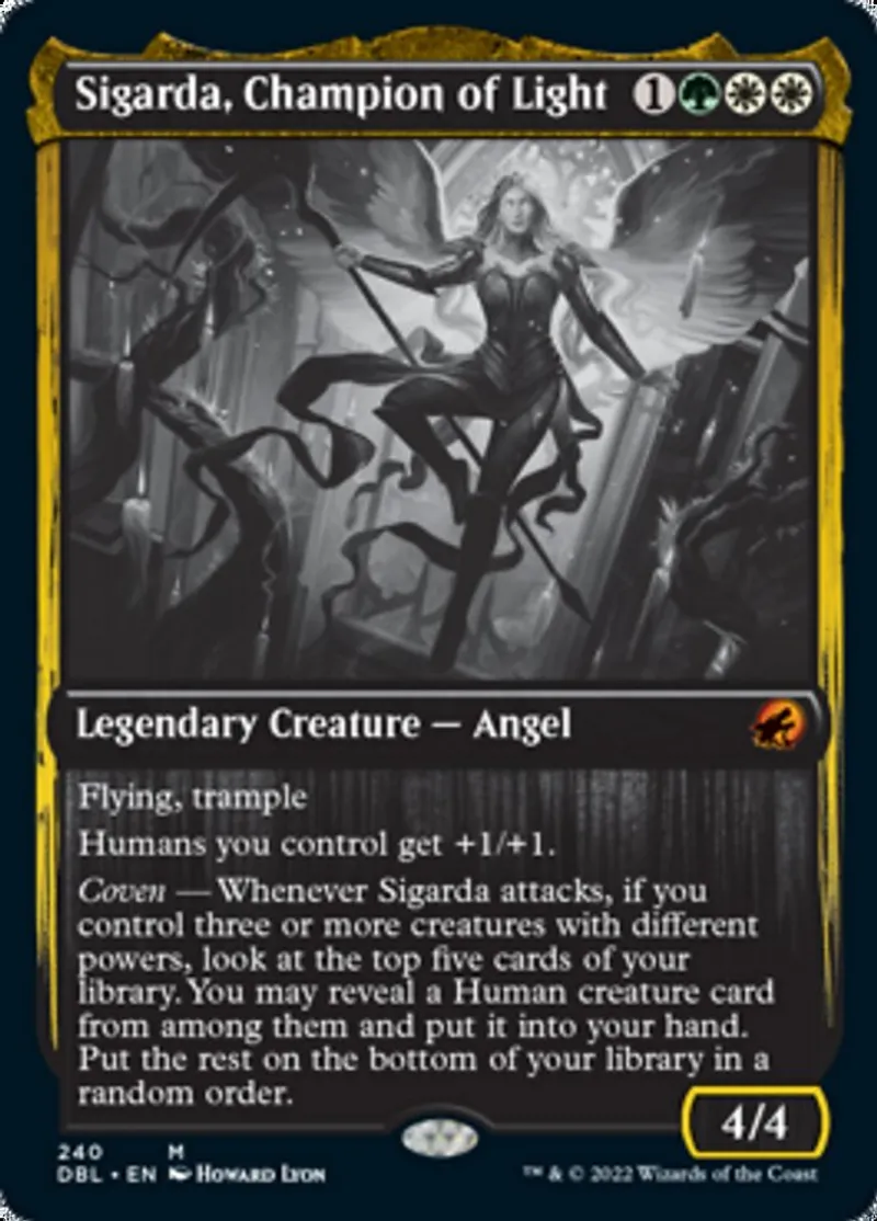 Coven — Whenever Sigarda attacks, if you control three or more creatures with different powers, look at the top five cards of your library. You may reveal a Human creature card from among them and put it into your hand. Put the rest on the bottom of your library in a random order. | ||
