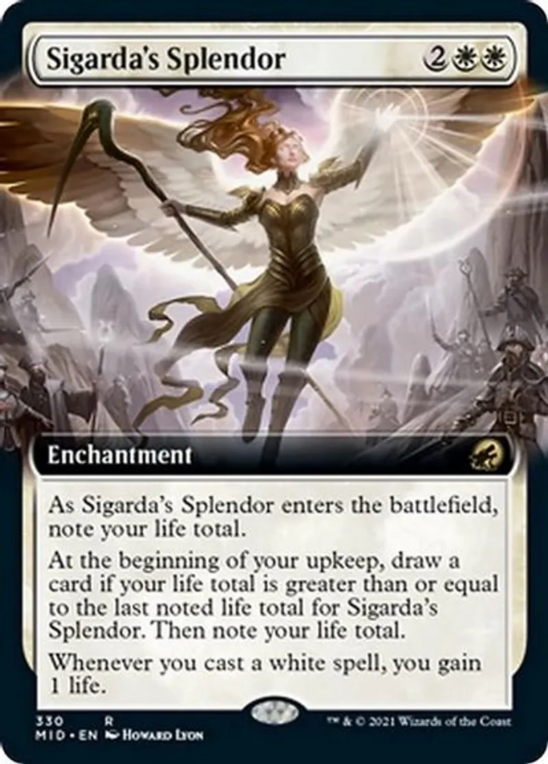 At the beginning of your upkeep, draw a card if your life total is greater than or equal to the last noted life total for Sigarda’s Splendor. Then note your life total.