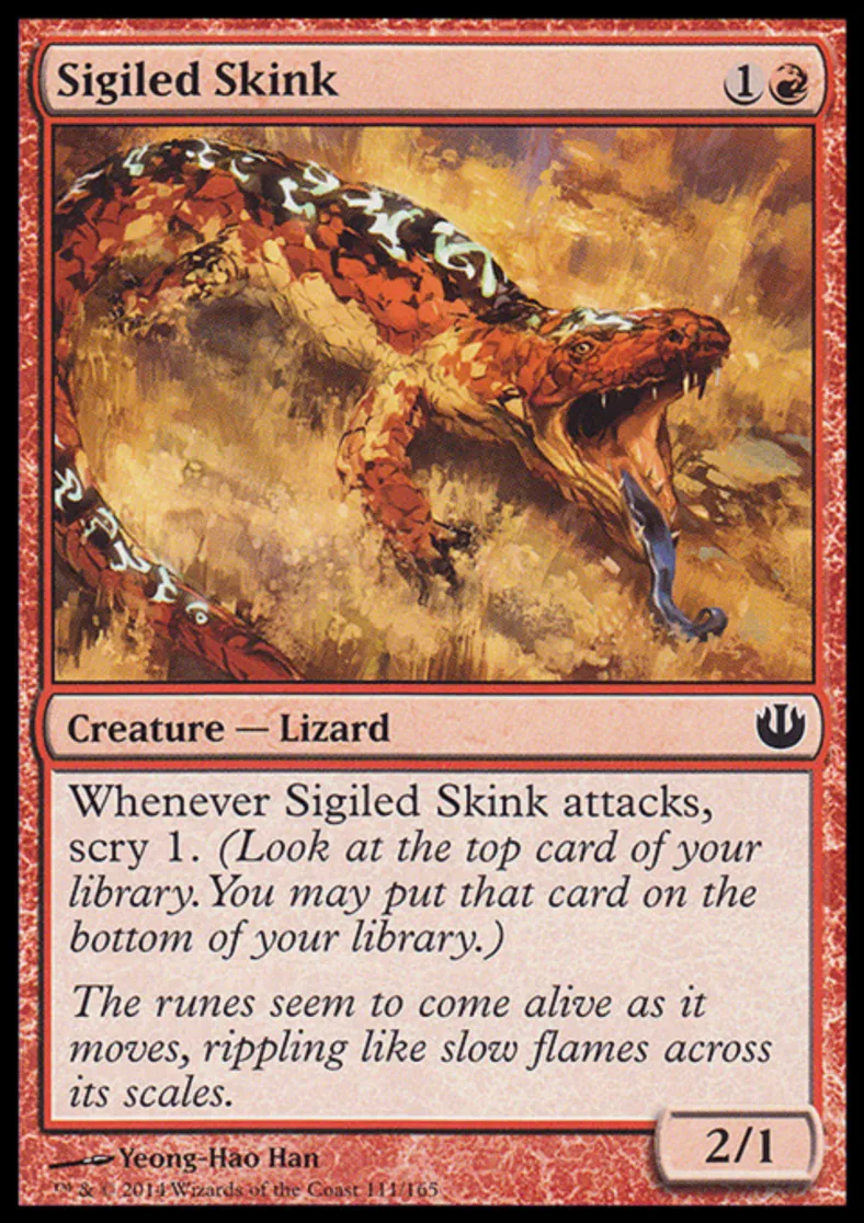 | Oracle Text | Whenever Sigiled Skink attacks, scry 1. (Look at the top card of your library. You may put that card on the bottom of your library.) | ||