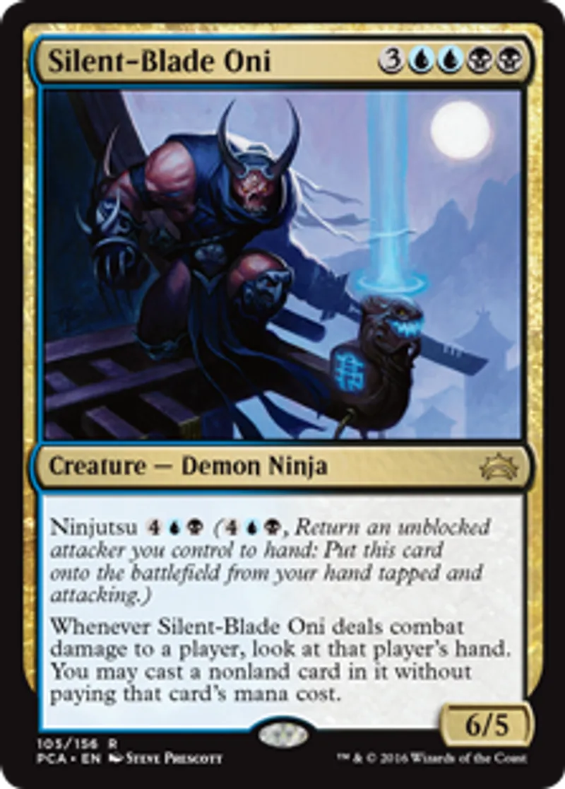 | Oracle Text | Ninjutsu {{4}}{{u}}{{b}} ({{4}}{{u}}{{b}}, Return an unblocked attacker you control to hand: Put this card onto the battlefield from your hand tapped and attacking.) Whenever Silent-Blade Oni deals combat damage to a player, look at that player's hand. You may cast a nonland card in it without paying that card's mana cost. | ||