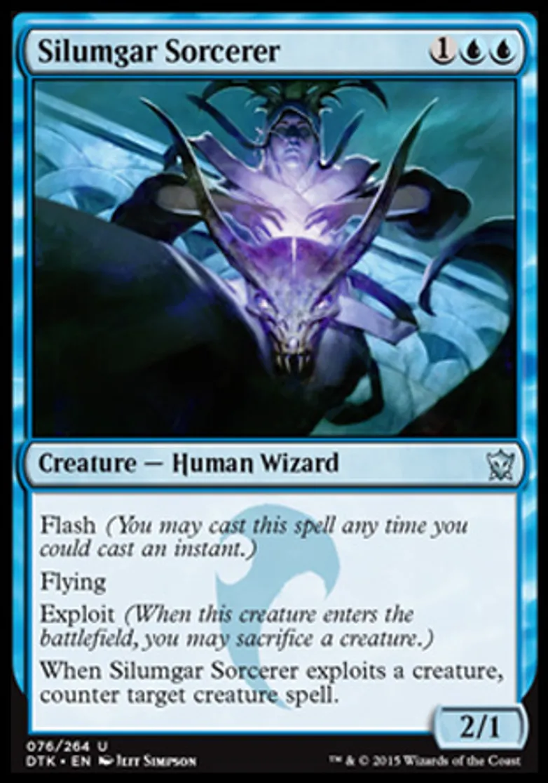 | Oracle Text | Flash (You may cast this spell any time you could cast an instant.) Flying Exploit (When this creature enters the battlefield, you may sacrifice a creature.) When Silumgar Sorcerer exploits a creature, counter target creature spell. | ||