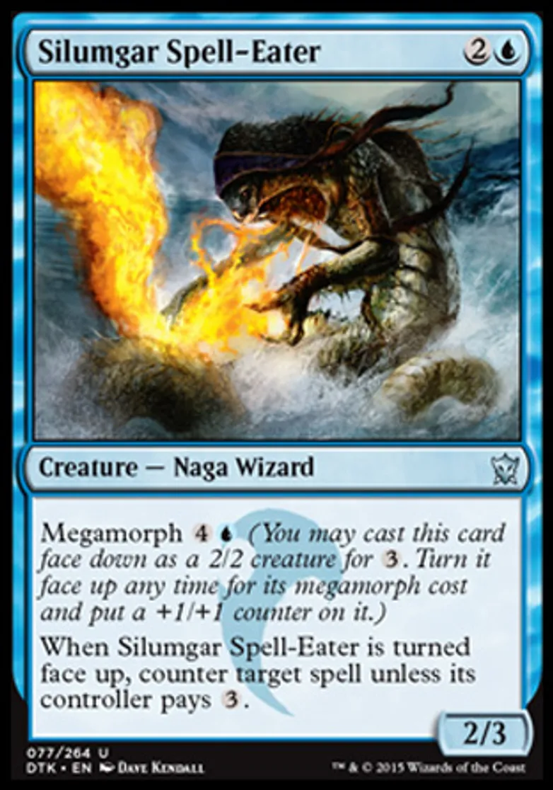| Oracle Text | Megamorph {{4}}{{u}} (You may cast this card face down as a 2/2 creature for {{3}}. Turn it face up any time for its megamorph cost and put a +1/+1 counter on it.) When Silumgar Spell-Eater is turned face up, counter target spell unless its controller pays {{3}}. | ||