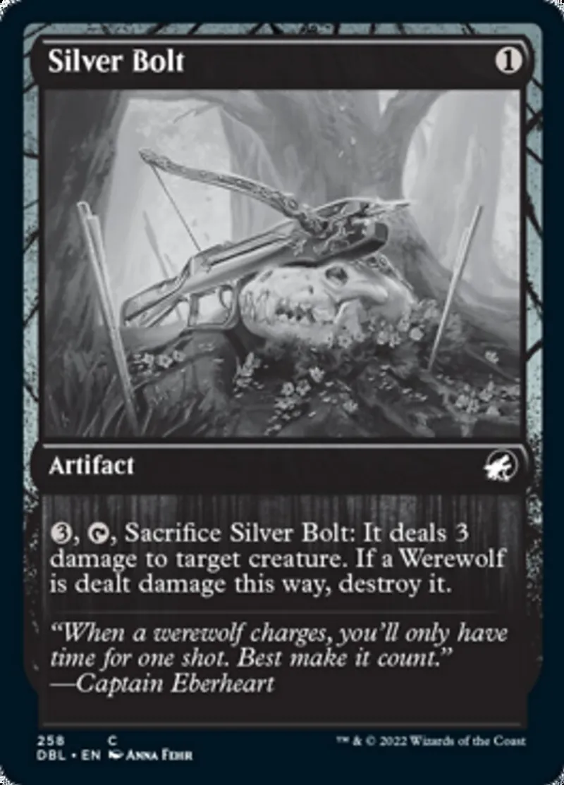 | Oracle Text | {3}, {T}, Sacrifice Silver Bolt: It deals 3 damage to target creature. If a Werewolf is dealt damage this way, destroy it. | ||