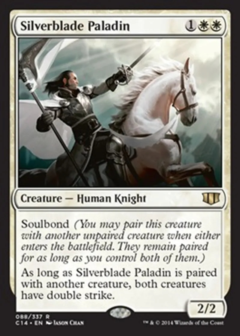 | Oracle Text | Soulbond (You may pair this creature with another unpaired creature when either enters the battlefield. They remain paired for as long as you control both of them.) As long as Silverblade Paladin is paired with another creature, both creatures have double strike. | ||