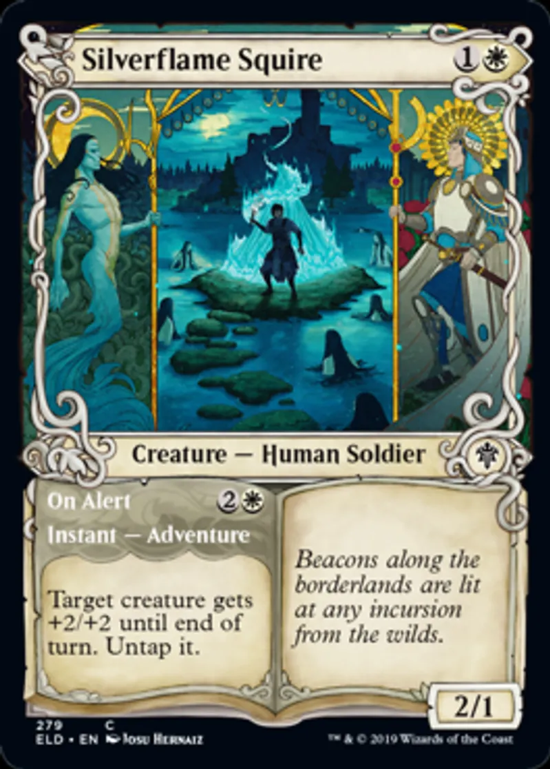 Magic: the Gathering (mtg) Common Creature — Human Soldier // Instant — Adventure Silverflame Squire from Throne of Eldraine (ELD) last updated 2026-02-21 17:01:02