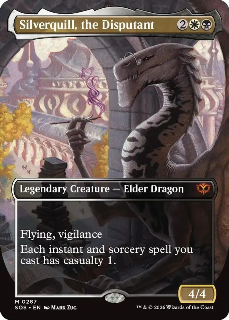 Magic: the Gathering (mtg) Mythic Rare legendary creature — elder dragon Silverquill, the Disputant from Secrets of Strixhaven (SOS) last updated 2026-04-16 23:12:04