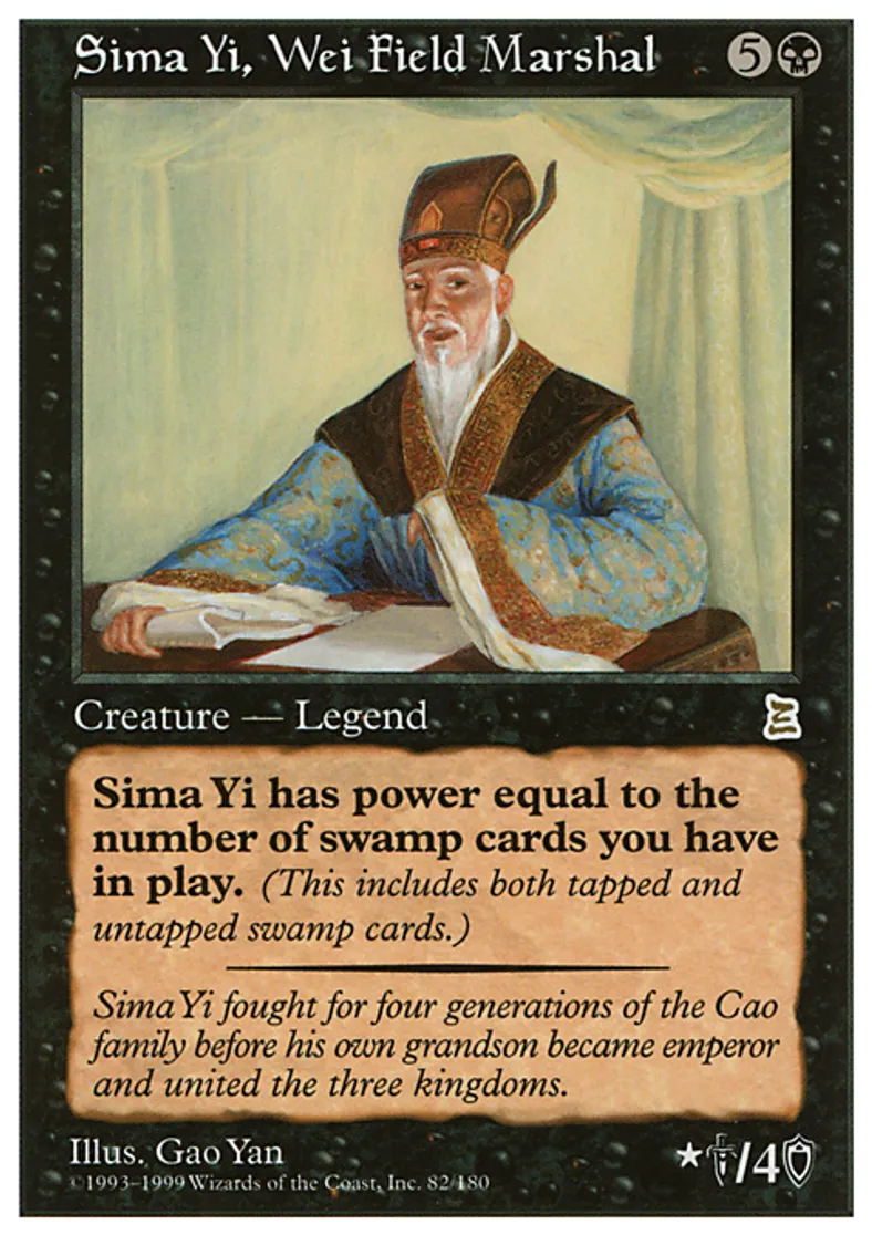 | Oracle Text | Sima Yi, Wei Field Marshal's power is equal to the number of Swamps you control. | ||