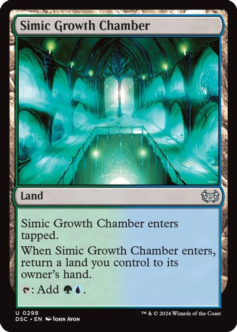 | Oracle Text | simic growth chamber enters the battlefield tapped. when simic growth chamber enters the battlefield, return a land you control to its owner's hand. t: add gu. | ||
