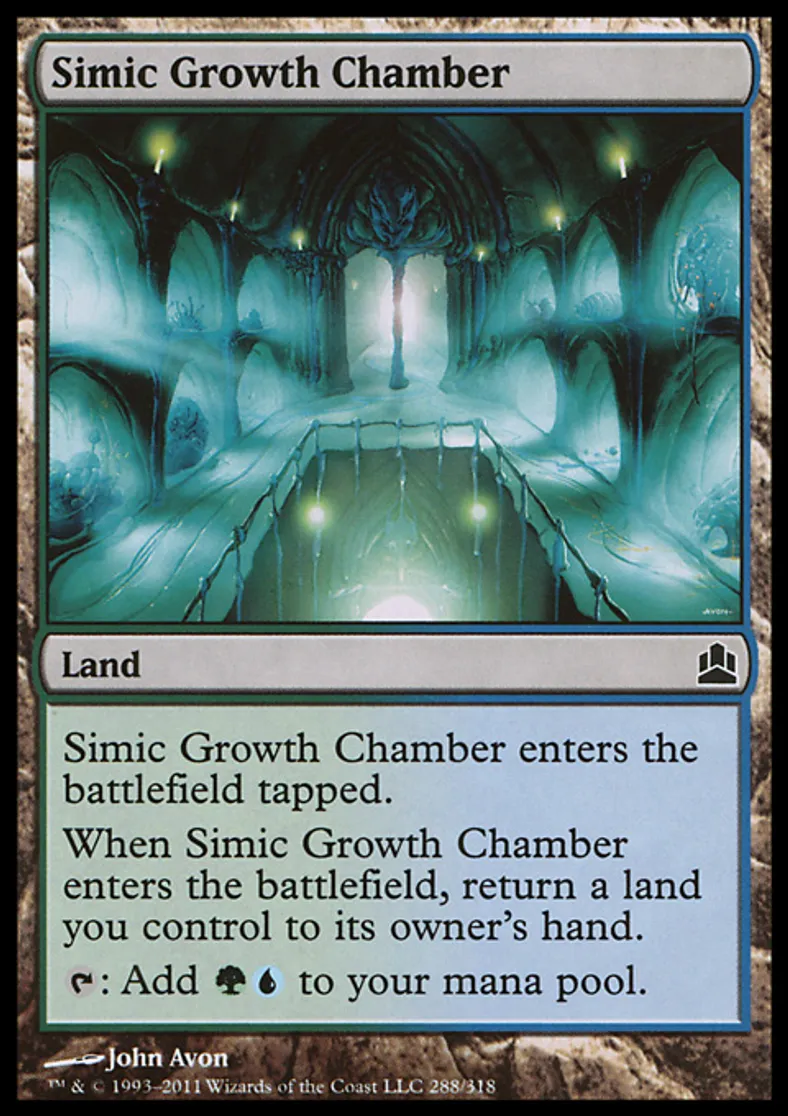 | Oracle Text | Simic Growth Chamber enters the battlefield tapped. When Simic Growth Chamber enters the battlefield, return a land you control to its owner's hand. {{t}}: Add {{g}}{{u}} to your mana pool. | ||