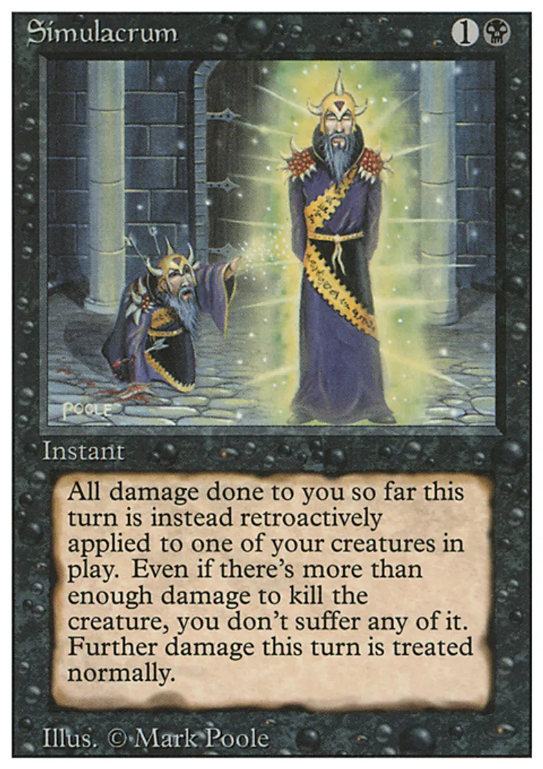 | Oracle Text | You gain life equal to the damage dealt to you this turn. Simulacrum deals damage to target creature you control equal to the damage dealt to you this turn. | ||