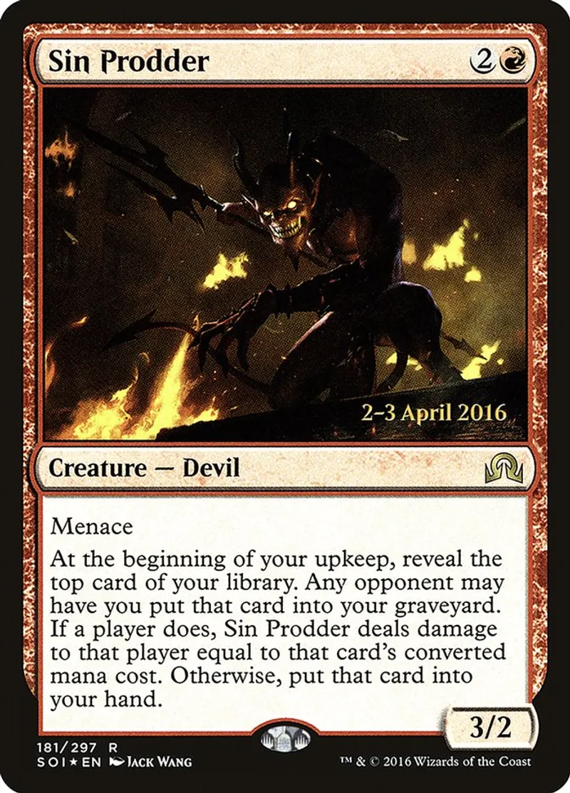At the beginning of your upkeep, reveal the top card of your library. Any opponent may have you put that card into your graveyard. If a player does, Sin Prodder deals damage to that player equal to that card’s converted mana cost. Otherwise, put that card into your hand. | ||