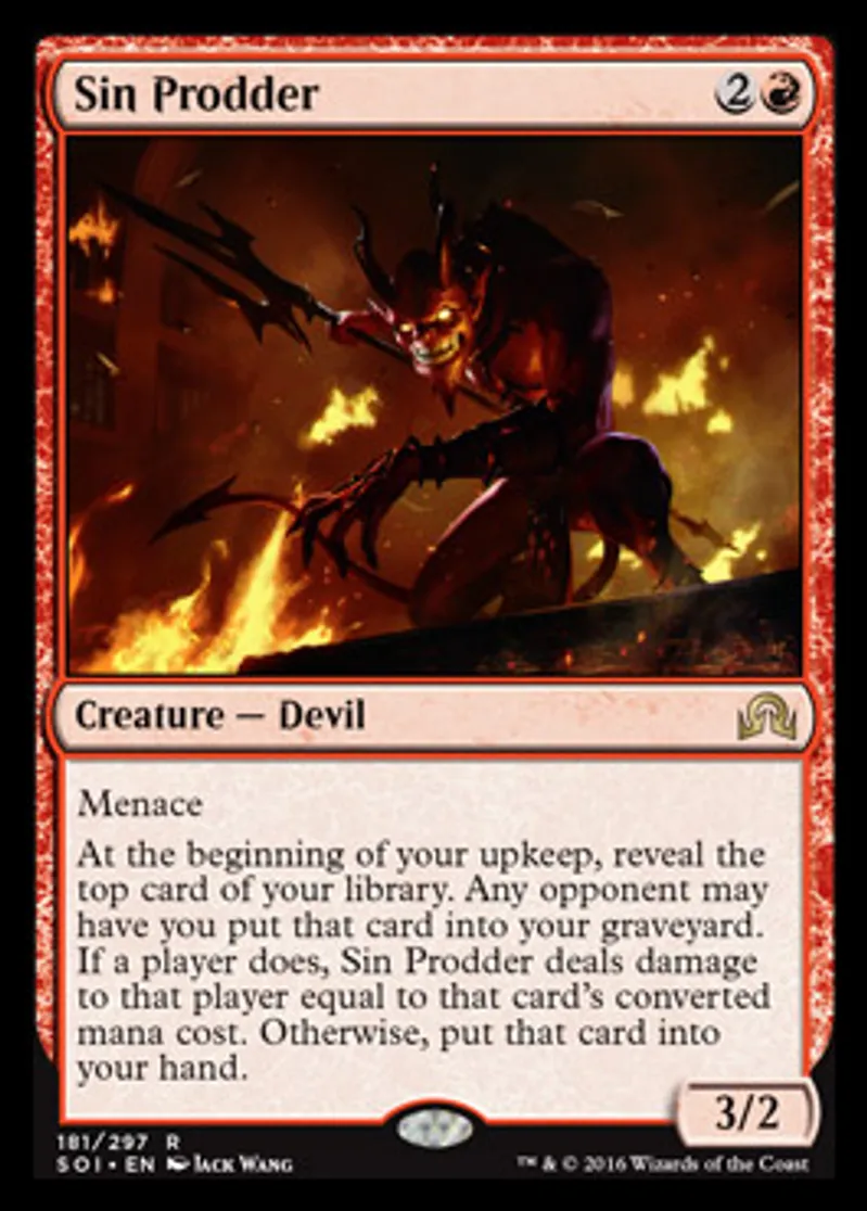 | Oracle Text | Menace At the beginning of your upkeep, reveal the top card of your library. Any opponent may have you put that card into your graveyard. If a player does, Sin Prodder deals damage to that player equal to that card's converted mana cost. Otherwise, put that card into your hand. | ||