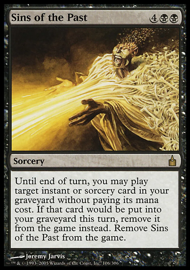 | Oracle Text | Until end of turn, you may cast target instant or sorcery card from your graveyard without paying its mana cost. If that card would be put into your graveyard this turn, exile it instead. Exile Sins of the Past. | ||