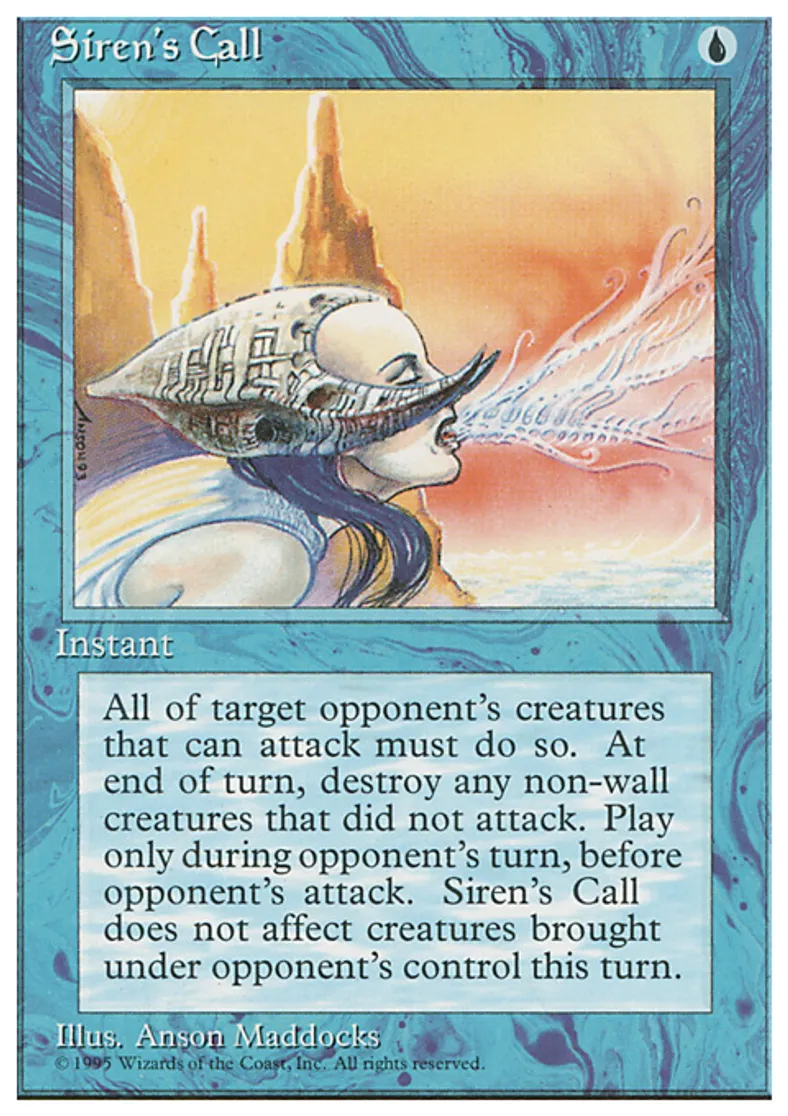 | Oracle Text | Cast Siren's Call only during an opponent's turn, before attackers are declared. Creatures the active player controls attack this turn if able. At the beginning of the next end step, destroy all non-Wall creatures that player controls that didn't attack this turn. Ignore this effect for each creature the player didn't control continuously since the beginning of the turn. | ||