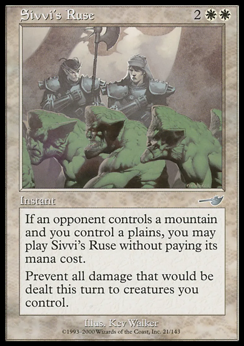 | Oracle Text | If an opponent controls a Mountain and you control a Plains, you may cast Sivvi's Ruse without paying its mana cost. Prevent all damage that would be dealt this turn to creatures you control. | ||
