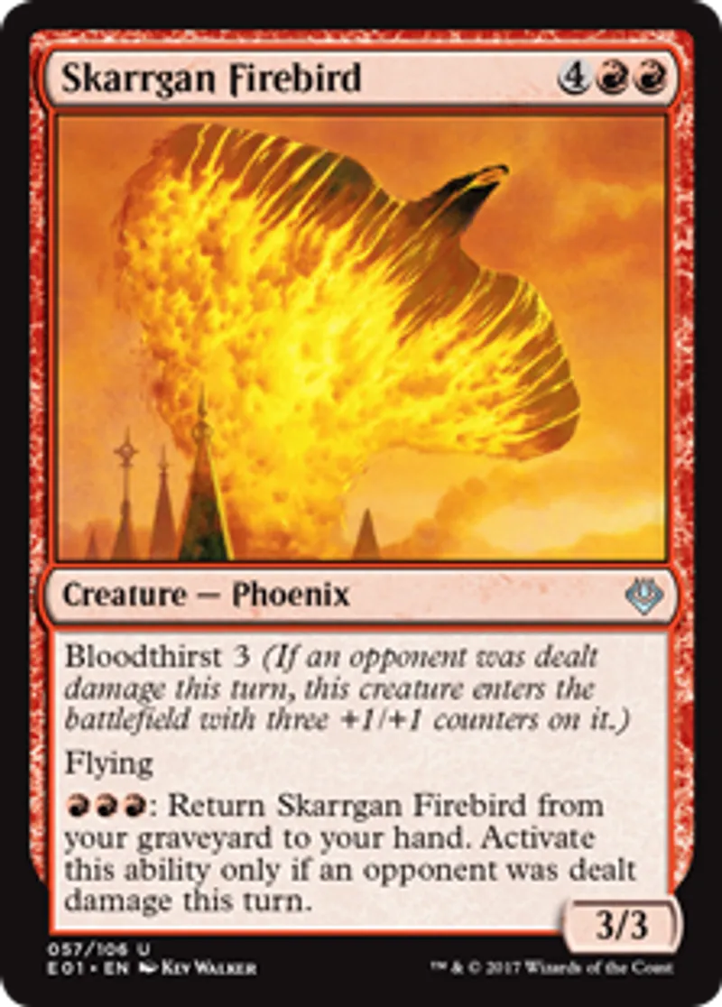 | Oracle Text | Bloodthirst 3 (If an opponent was dealt damage this turn, this creature enters the battlefield with three +1/+1 counters on it.) Flying {{r}}{{r}}{{r}}: Return Skarrgan Firebird from your graveyard to your hand. Activate this ability only if an opponent was dealt damage this turn. | ||