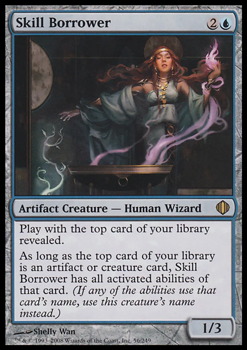 | Oracle Text | Play with the top card of your library revealed. As long as the top card of your library is an artifact or creature card, Skill Borrower has all activated abilities of that card. (If any of the abilities use that card's name, use this creature's name instead.) | ||