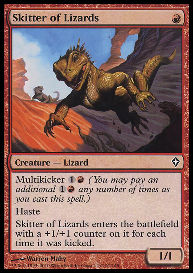 | Oracle Text | Multikicker {{1}}{{r}} (You may pay an additional {{1}}{{r}} any number of times as you cast this spell.) Haste Skitter of Lizards enters the battlefield with a +1/+1 counter on it for each time it was kicked. | ||