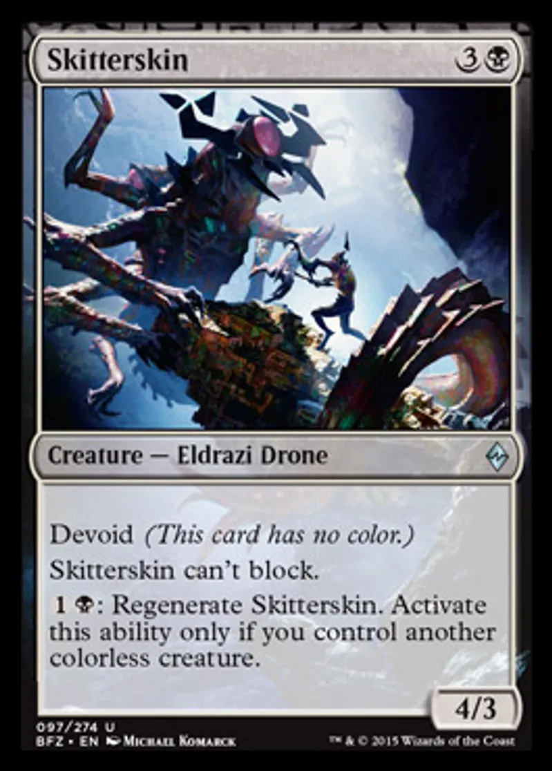 | Oracle Text | Devoid (This card has no color.) Skitterskin can't block. {{1}}{{b}}: Regenerate Skitterskin. Activate this ability only if you control another colorless creature. | ||