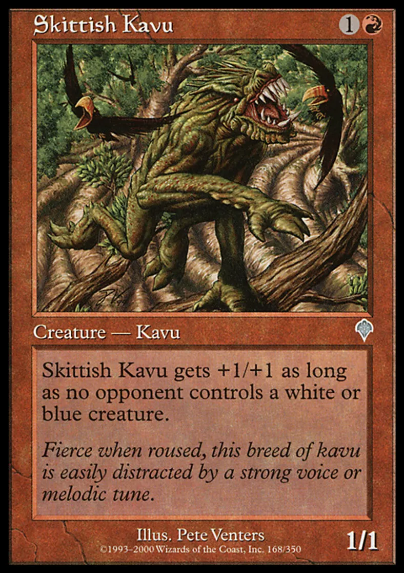 | Oracle Text | Skittish Kavu gets +1/+1 as long as no opponent controls a white or blue creature. | ||