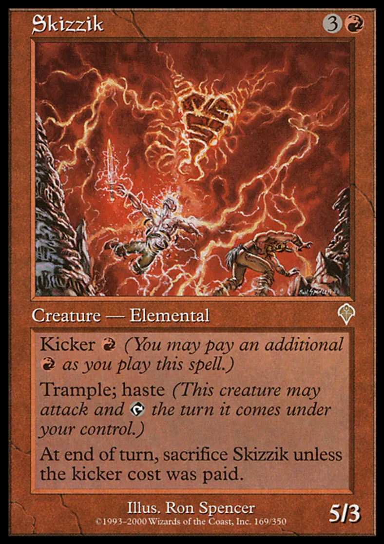 | Oracle Text | Kicker {{r}} (You may pay an additional {{r}} as you cast this spell.) Trample, haste At the beginning of the end step, sacrifice Skizzik unless it was kicked. | ||
