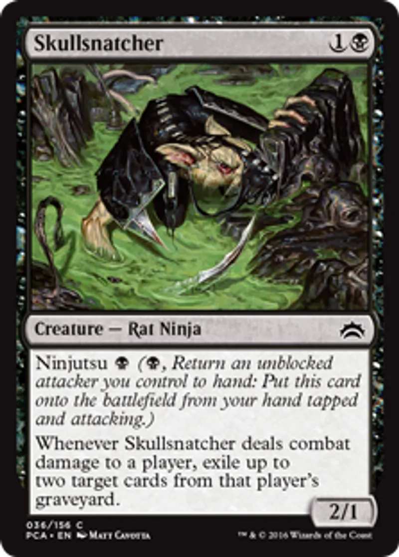 | Oracle Text | Ninjutsu {{b}} ({{b}}, Return an unblocked attacker you control to hand: Put this card onto the battlefield from your hand tapped and attacking.) Whenever Skullsnatcher deals combat damage to a player, exile up to two target cards from that player's graveyard. | ||