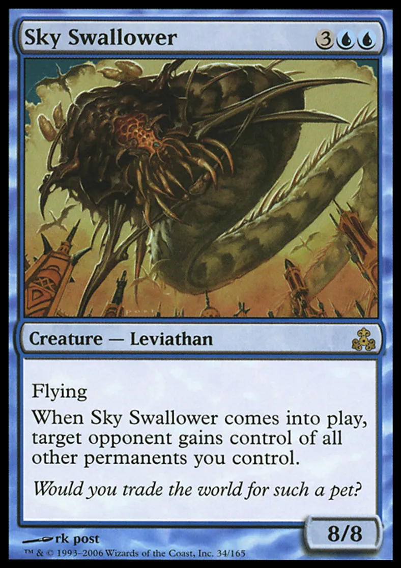 | Oracle Text | Flying When Sky Swallower enters the battlefield, target opponent gains control of all other permanents you control. | ||