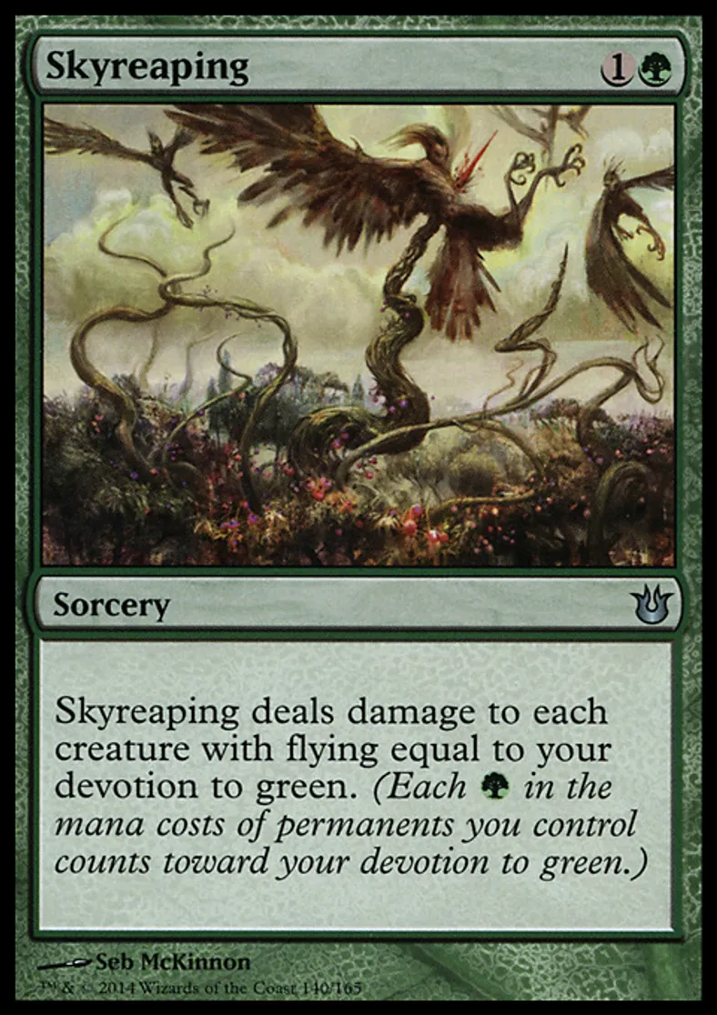 | Oracle Text | Skyreaping deals damage to each creature with flying equal to your devotion to green. (Each {{g}} in the mana costs of permanents you control counts toward your devotion to green.) | ||