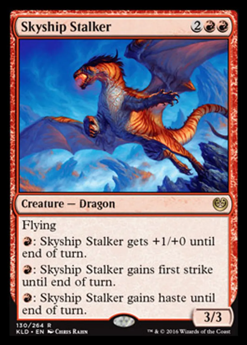 | Oracle Text | Flying {{r}}: Skyship Stalker gets +1/+0 until end of turn. {{r}}: Skyship Stalker gains first strike until end of turn. {{r}}: Skyship Stalker gains haste until end of turn. | ||