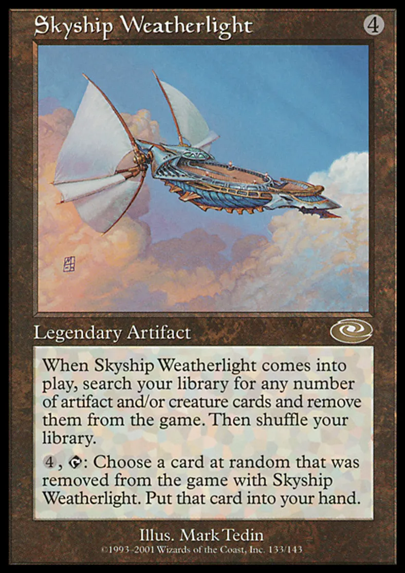 | Oracle Text | When Skyship Weatherlight enters the battlefield, search your library for any number of artifact and/or creature cards and exile them. Then shuffle your library. {{4}}, {{t}}: Choose a card at random that was exiled with Skyship Weatherlight. Put that card into its owner's hand. | ||