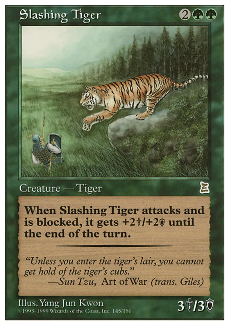 | Oracle Text | Whenever Slashing Tiger becomes blocked, it gets +2/+2 until end of turn. | ||