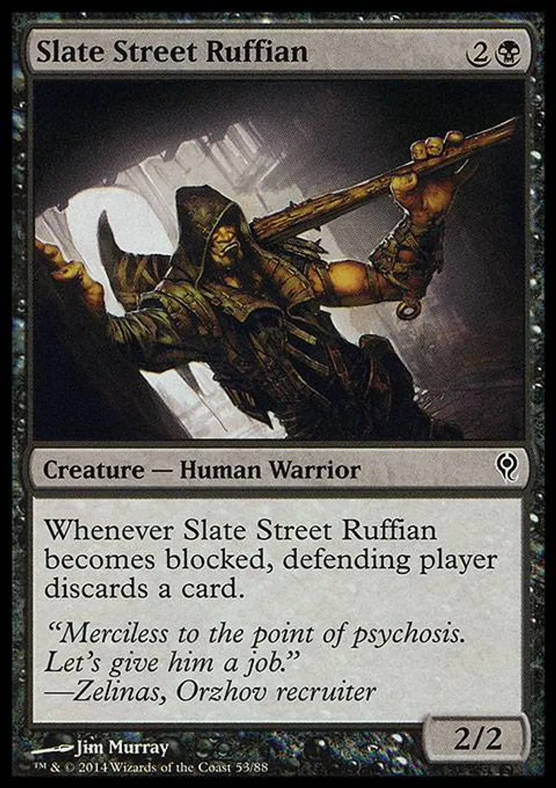 | Oracle Text | Whenever Slate Street Ruffian becomes blocked, defending player discards a card. | ||