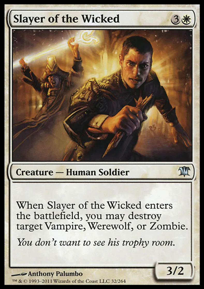 | Oracle Text | When Slayer of the Wicked enters the battlefield, you may destroy target Vampire, Werewolf, or Zombie. | ||