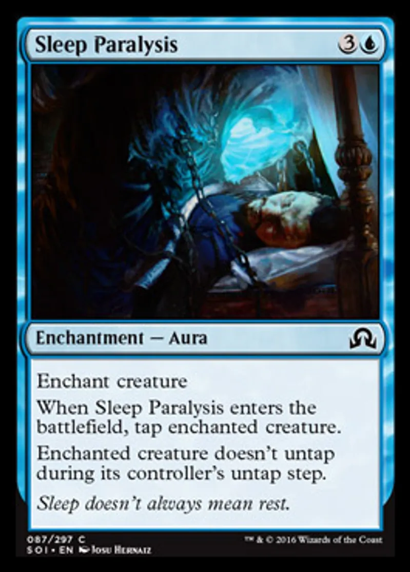 | Oracle Text | Enchant creature When Sleep Paralysis enters the battlefield, tap enchanted creature. Enchanted creature doesn't untap during its controller's untap step. | ||