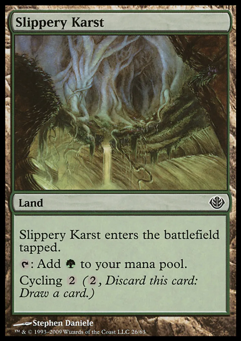 | Oracle Text | Slippery Karst enters the battlefield tapped. {{t}}: Add {{g}} to your mana pool. Cycling {{2}} ({{2}}, Discard this card: Draw a card.) | ||