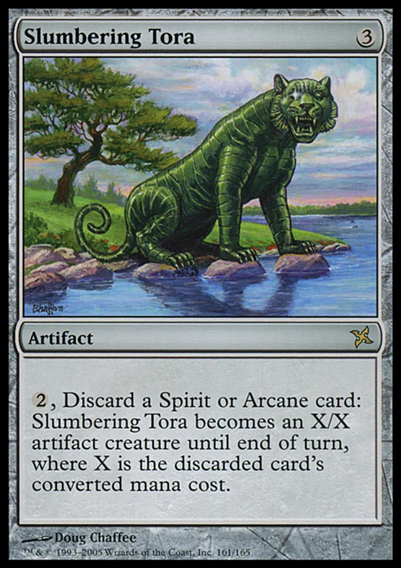 | Oracle Text | {{2}}, Discard a Spirit or Arcane card: Slumbering Tora becomes an X/X Cat artifact creature until end of turn, where X is the discarded card's converted mana cost. | ||