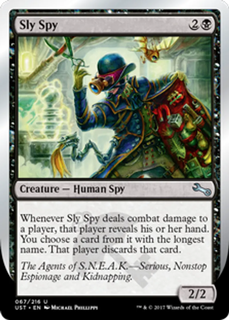 | Oracle Text | Whenever Sly Spy deals combat damage to a player, that player reveals his or her hand. You choose a card from it with the longest name. That player discards that card. | ||