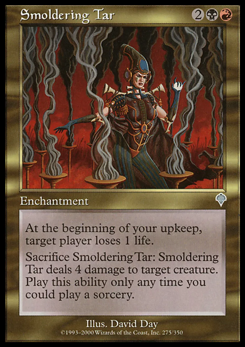 | Oracle Text | At the beginning of your upkeep, target player loses 1 life. Sacrifice Smoldering Tar: Smoldering Tar deals 4 damage to target creature. Activate this ability only any time you could cast a sorcery. | ||