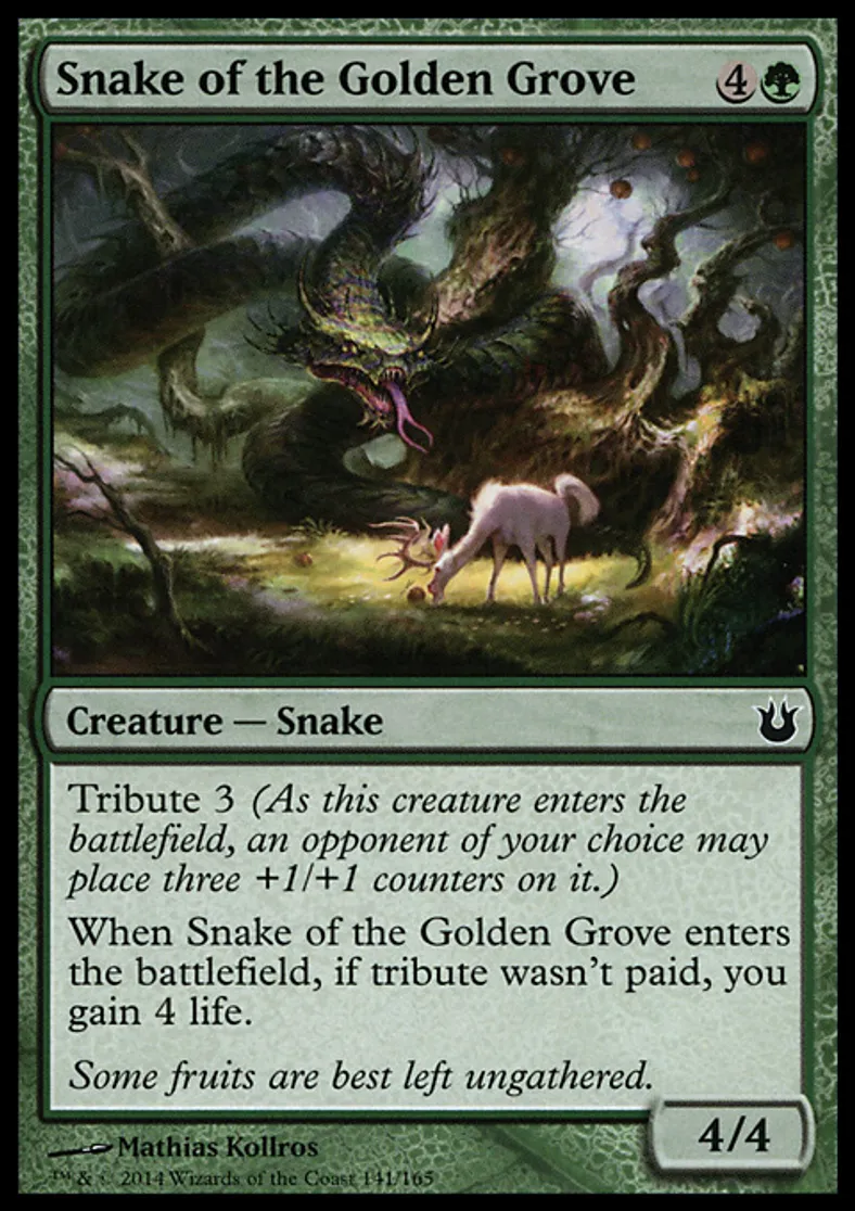 | Oracle Text | Tribute 3 (As this creature enters the battlefield, an opponent of your choice may place three +1/+1 counters on it.) When Snake of the Golden Grove enters the battlefield, if tribute wasn't paid, you gain 4 life. | ||