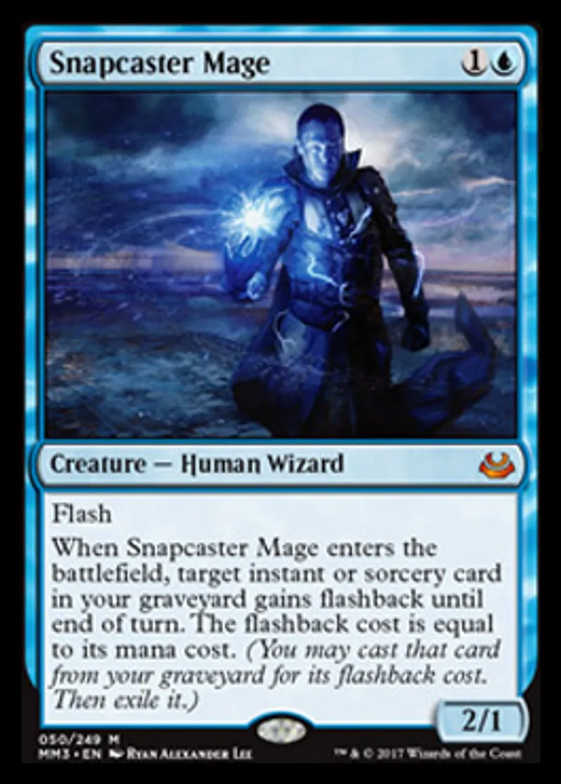 When Snapcaster Mage enters the battlefield, target instant or sorcery card in your graveyard gains flashback until end of turn. The flashback cost is equal to its converted mana cost. (You may cast that card from your graveyard for its flashback cost. Then exile it.) | ||